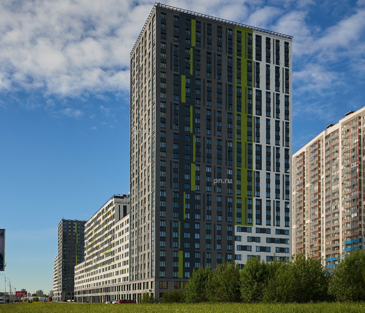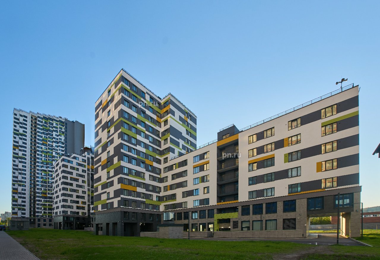 IN2IT состоит из двух корпусов переменной этажности – 7-29 этажей. Для фасадов была выбрана строгая серо-белая цветовая гамма, которую разбавляют яркие зеленые и желтые акценты. Рядом с корпусами предусмотрена парковочная зона на 230 машино-мест.