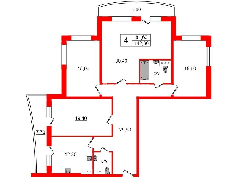 Комнаты: 19.4 + 15.9 + 30.4 + 15.9