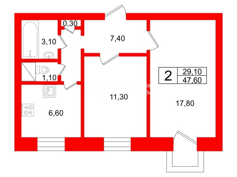 2-комн. кв. 47.6 м² у метро Площадь Ленина