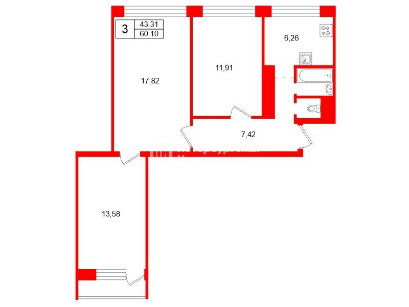 3-комн. кв. 60.1 м² у метро Проспект Ветеранов