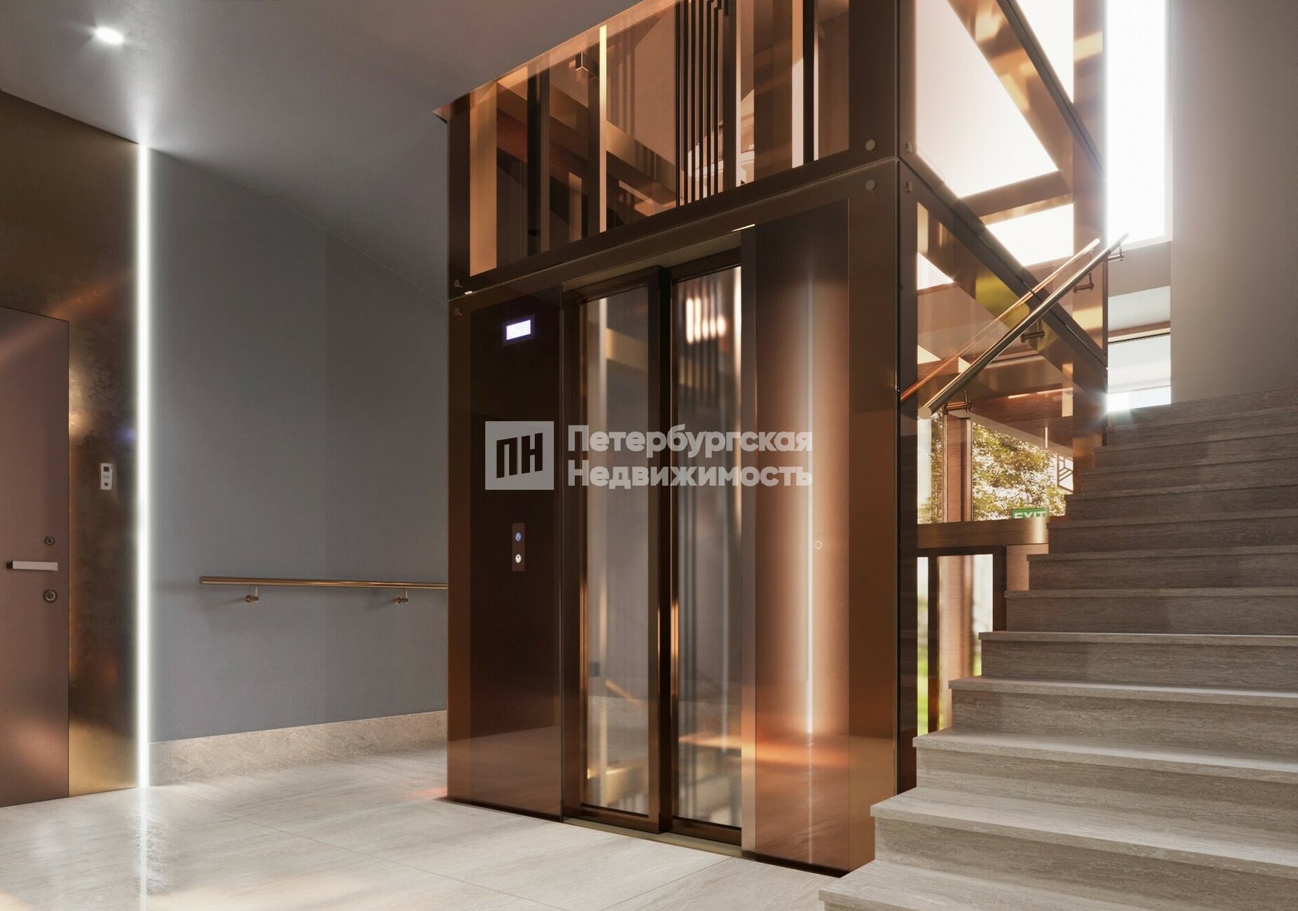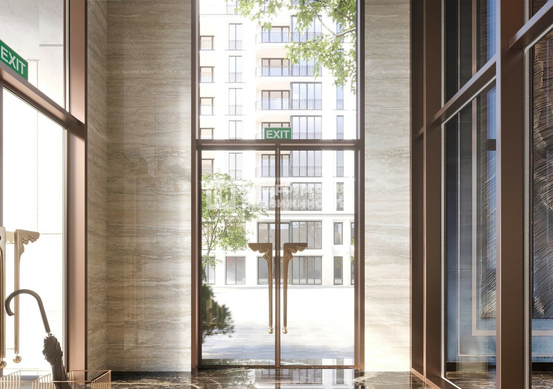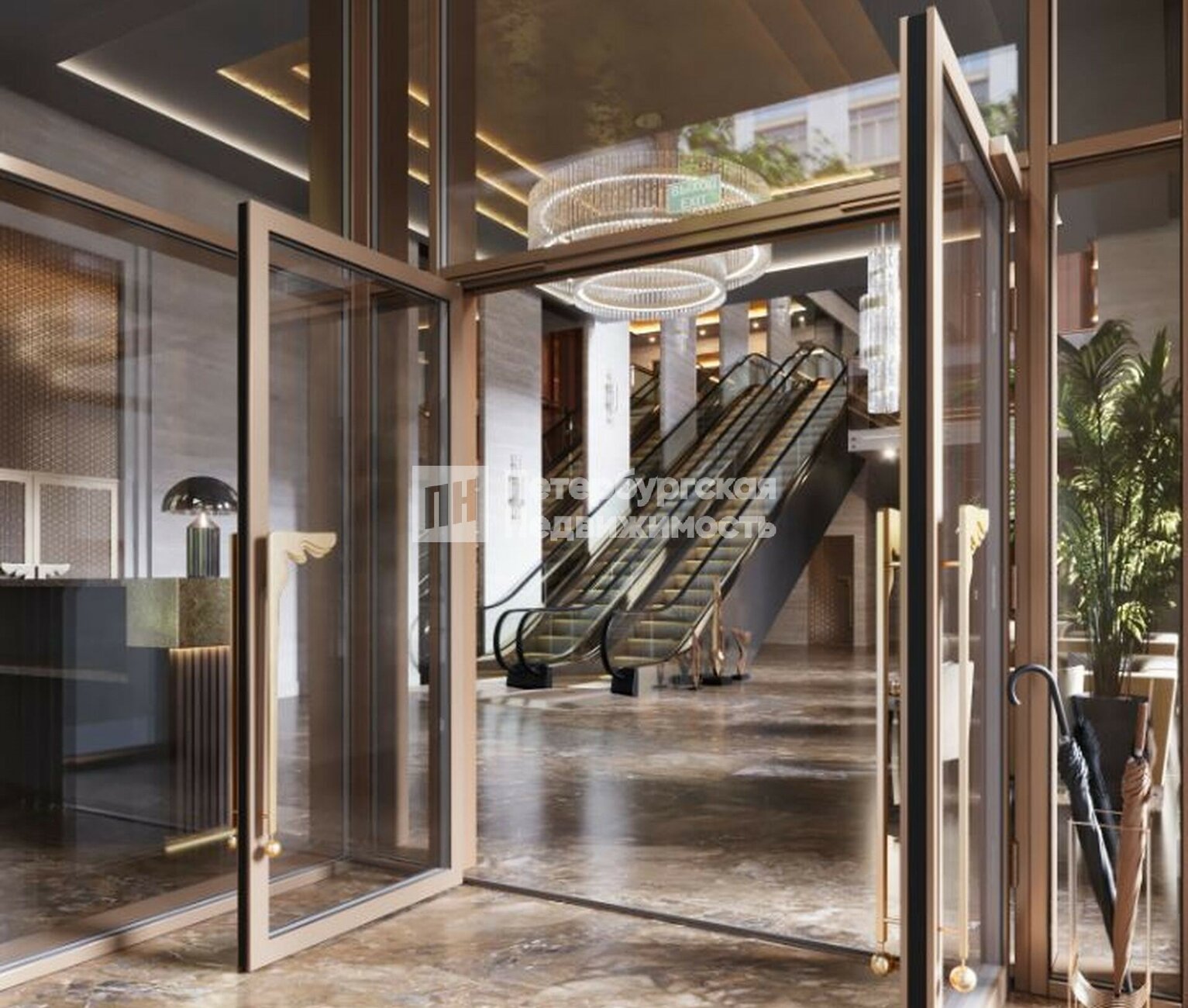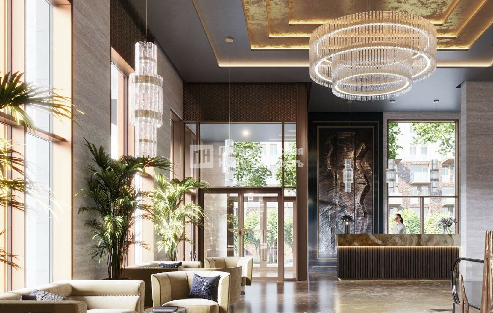 Каждый корпус имеет индивидуальное оформление входных групп. При этом все холлы выполнены в единой стилистике. На первом этаже расположится стойка ресепшн, консьерж-сервис, зона ожидания с дизайнерской мебелью. На второй уровень поднимается эскалатор, здесь в просторном лобби можно встречать гостей или проводить деловые переговоры.