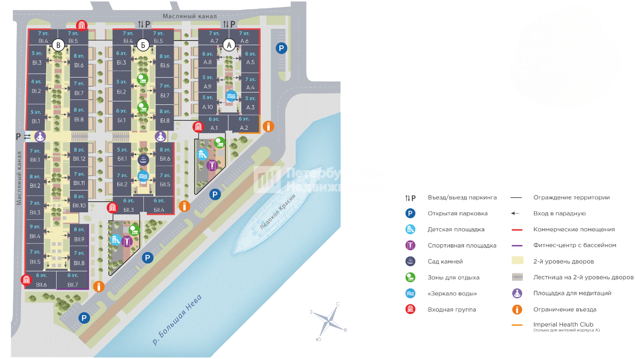 Концепция благоустройства пропитана духом Санкт-Петербурга. Единая территория разделена на визуальные зоны: двор, улица, канал, сквер. Каждый из этих образов традиционно присутствовал в исторической застройке Петербурга, и имеет свой уникальный характер и атмосферу. Полностью пешеходная набережная со ступенчатой архитектурой от Никиты Ильина, пропитана духом исторического Петербурга.