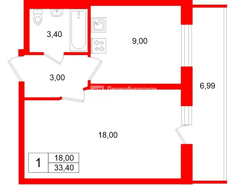 1-комн. кв. 33.4 м² у метро Комендантский Проспект