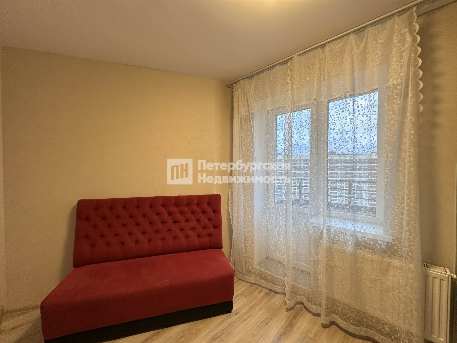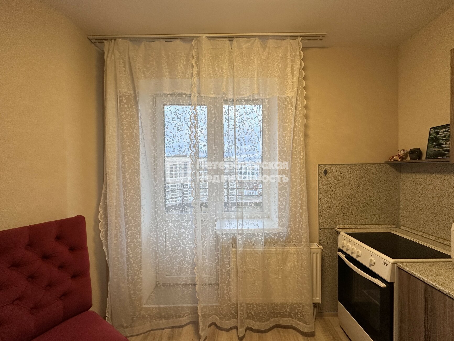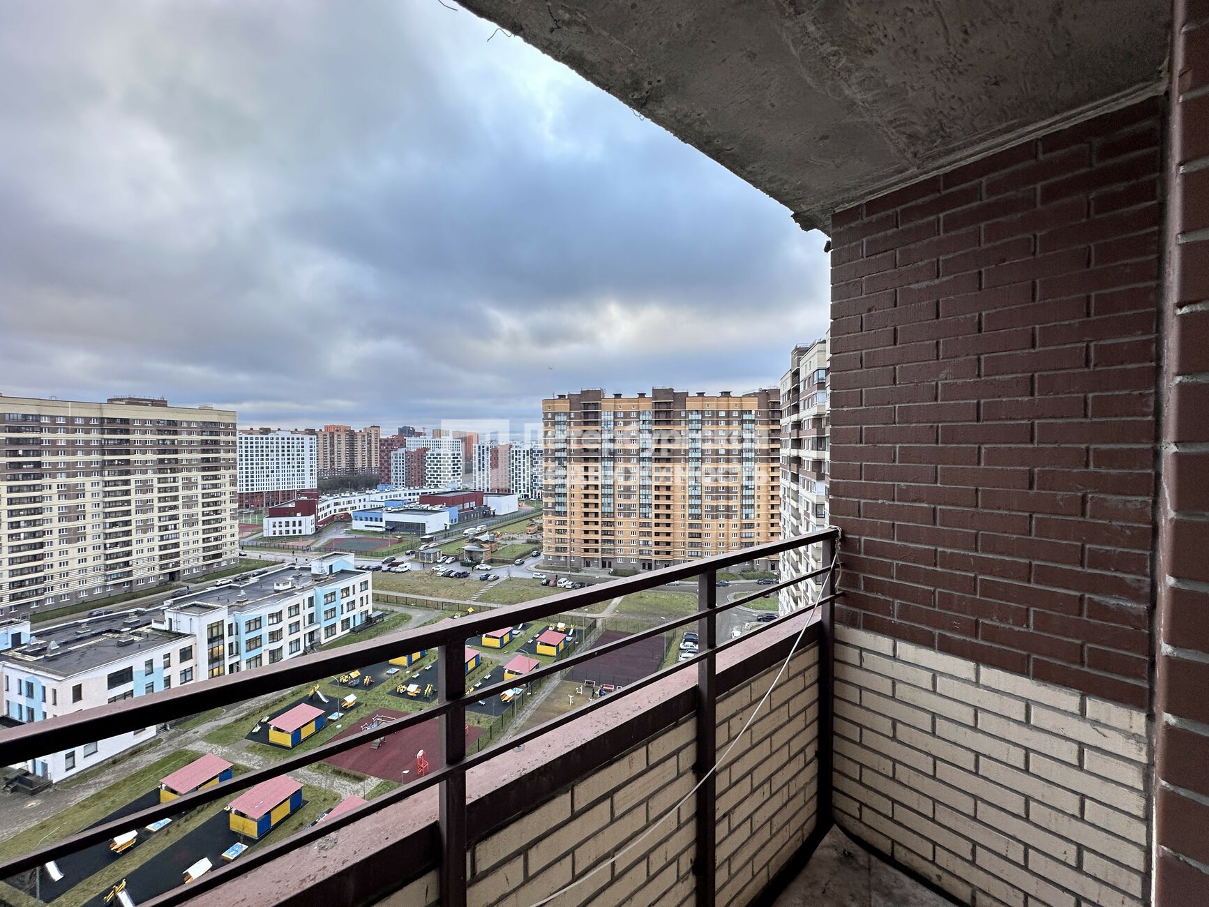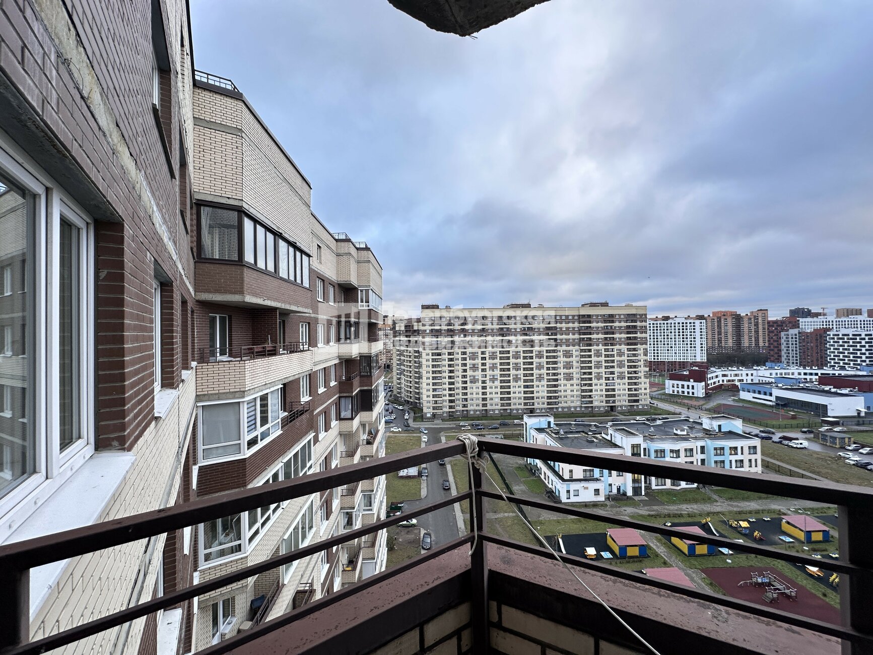 Квартира расположена на 14-ом этаже. Окна и балкон выходят во двор, на детский сад и спортивные площадки.