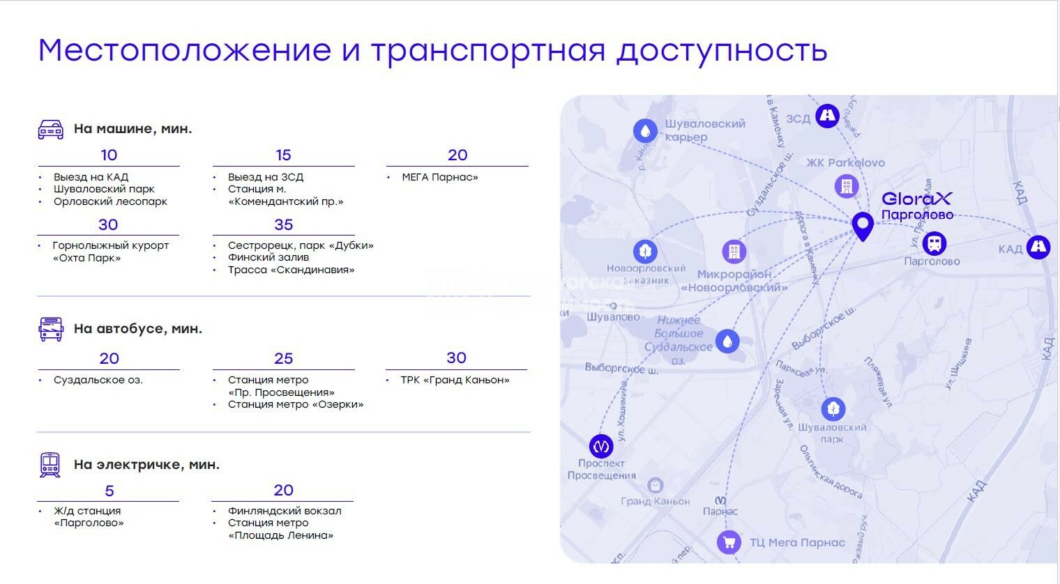 • Метро «Проспект Просвещения» / «Озерки»/ «Парнас»: 15-20 минут автомобилем